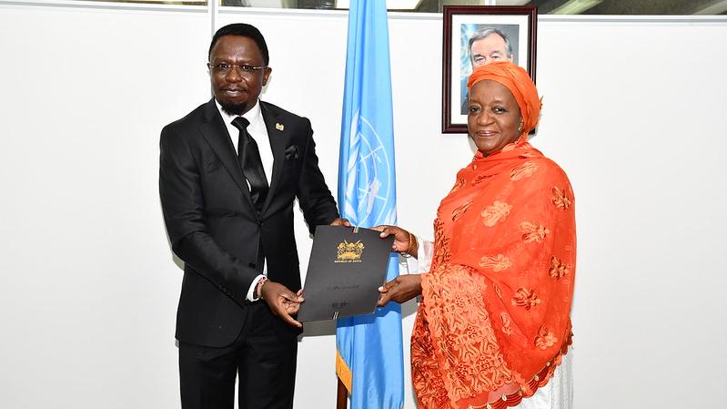 H.E Hon Ababu Namwamba the new Permanent Representative of the Republic of Kenya to the United Nations Office at Nairobi and United Nations Environment Programme presented his credentials to Madam Zainab Hawa Bangura the Director-General of the United Nations Office at Nairobi.